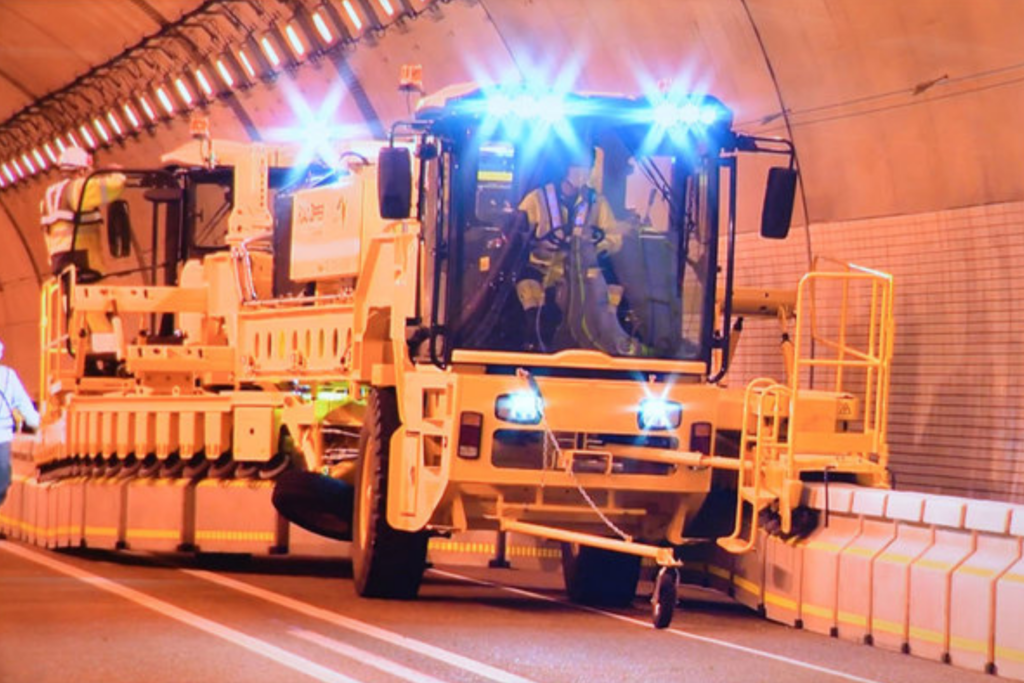 床版の取り替えは舗装を全て剥がして行うため、工事スペース確保のため長期の車線規制が敷かれます。そこで活用されているのが、コンクリート製防護柵と、それを移設する車両を用いた「ロードジッパー」と呼ばれるシステムです。ロードジッパーはアメリカで開発され、2016年にNEXCO東日本が日本で初めて試験導入し、今ではNEXCO中日本、西日本でも活用されています。